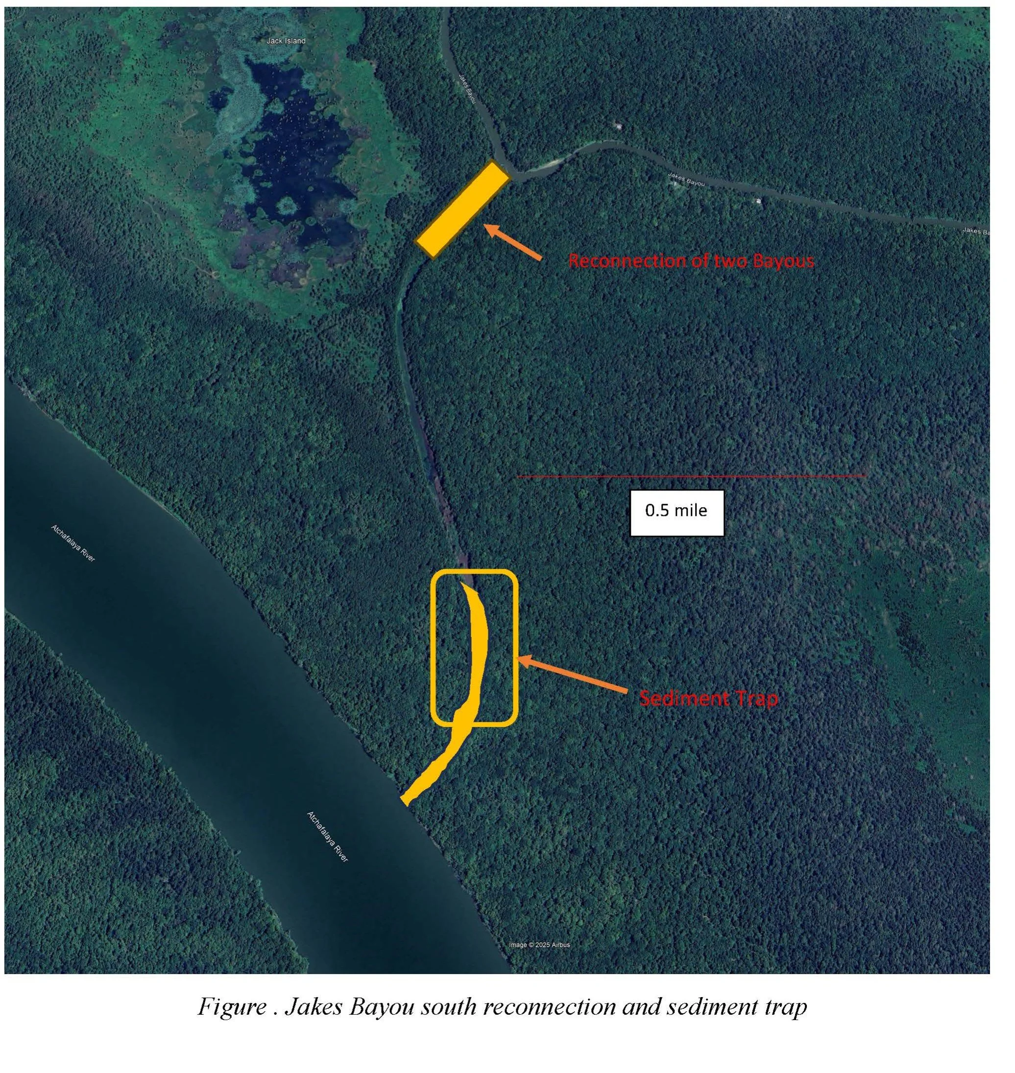 The realignment and straightening of Bayou Sorrel and the closure of Jakes Bayou around 1969-1970 increased bedload and sediments moving into Bayou Sorrel with significant negative effects to the hydrology of the floodplain, and ecological services. This needs to be reversed. Sand should be guided to stay in the main channel of the river, and sand from the river into the bayou should thereby be reduced. Sediment trap should be managed by depositing sand back in channel.